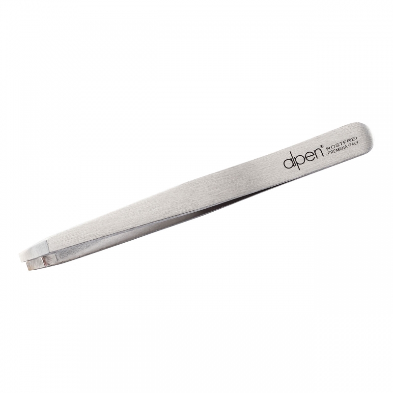 Pinzette von ALPEN mit schräger Spitze aus rostfreiem Edelstahl AISI 304, satiniert. Die schräge Spitze ermöglicht unter anderem das bestmögliche Greifen von Splittern in der Haut.