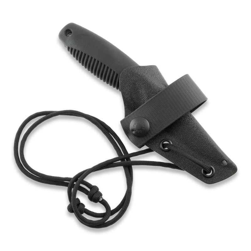 Dank des Pull-the-DOT®-Schnappverschlusses an der Kydexscheide lässt sich das Messer leicht am Gürtel befestigen und wieder abnehmen. Die Kydex-Scheide enthält auch ein Paracord Halsband, mit der das Messer um den Hals getragen werden kann.